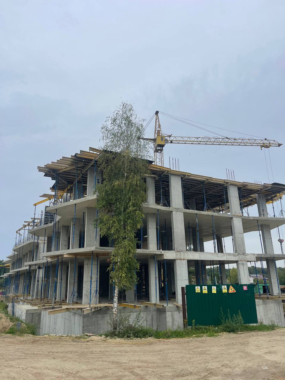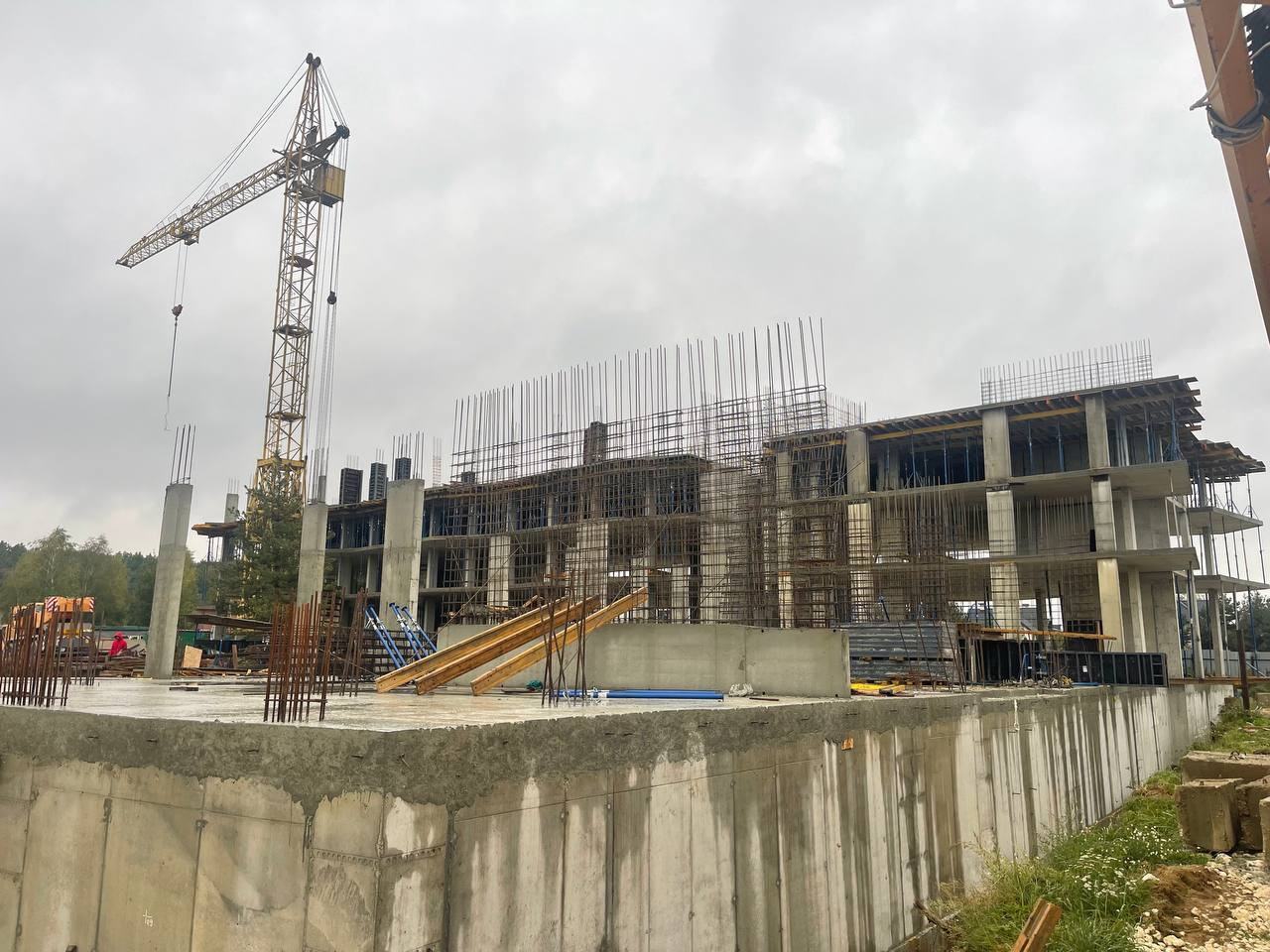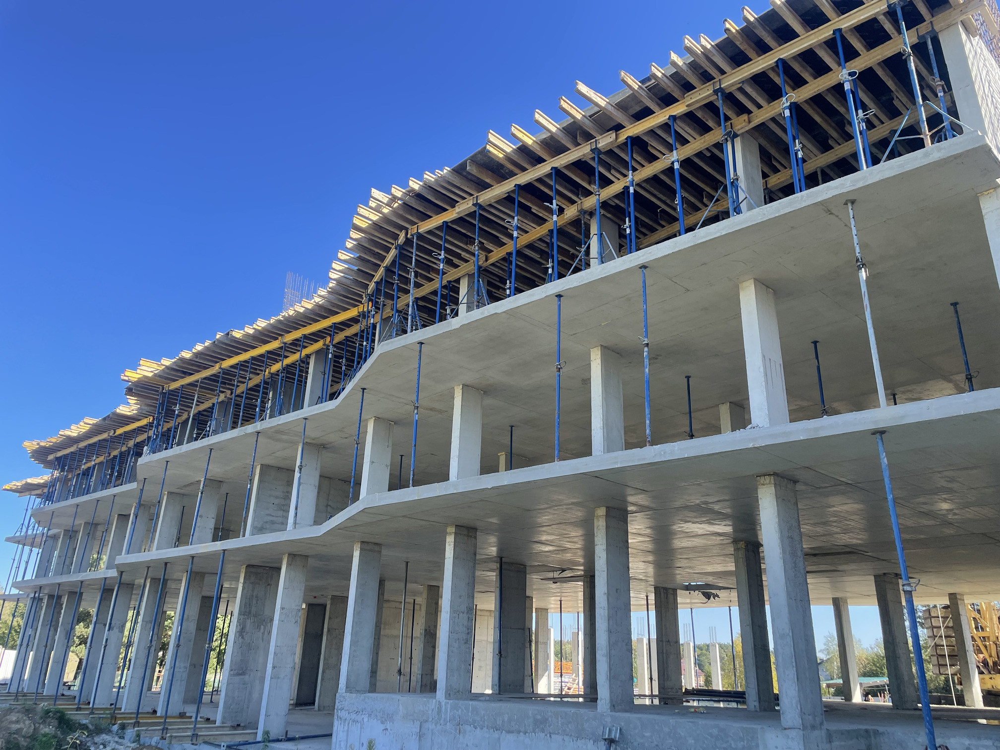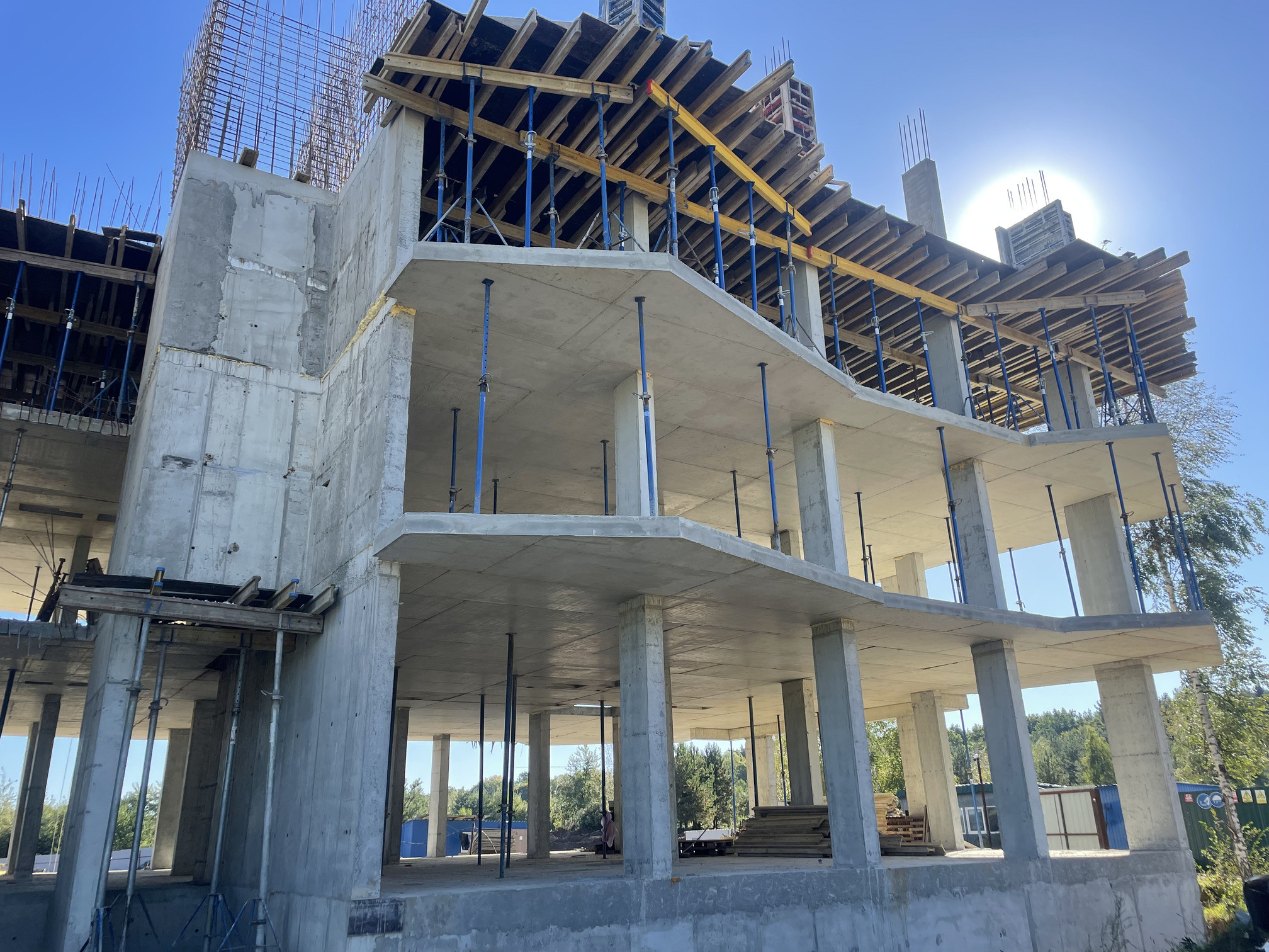 У вересні було виконано влаштування плити перекриття та вертикальних залізобетонних конструкцій третього поверху, проведено монтаж опалубки під перекриття четвертого поверху.